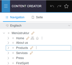 FirstSpirit provides a navigation aid in the ContentCreator. The navigation aid can be invoked anywhere in the ContentCreator: