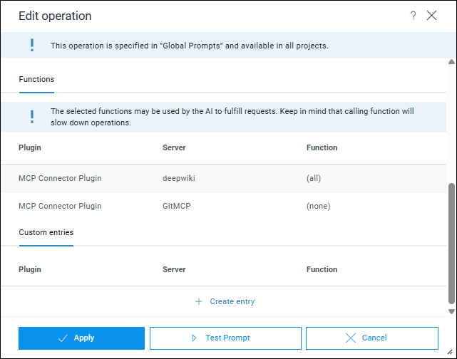- Optional: Activate one or more functions that can be used during the execution of the operation. Functions are provided by configured function servers, e.g., MCP servers, and allow the integration of external content in AI-based content creation.