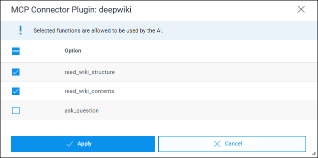 To allow the use of a function of a configured server, e.g., an MCP server, for an operation, you must enable it for the operation: