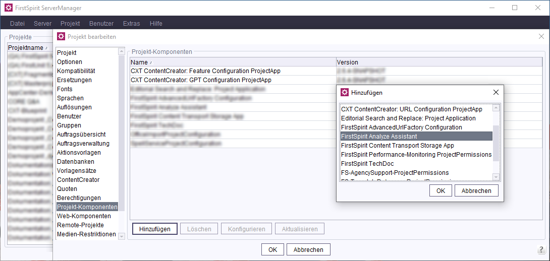 ServerManager > Projekt > Eigenschaften > [Projektauswahl] > Projekt-Komponenten > Hinzufügen > FirstSpirit Analyze Assistant