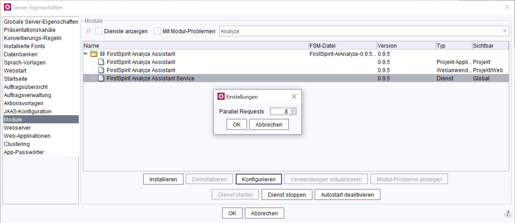 ServerManager > Server > Eigenschaften > Module - Wählen Sie das Modul FirstSpirit Analyze Assistant Service aus.