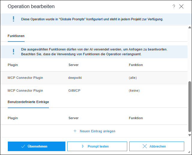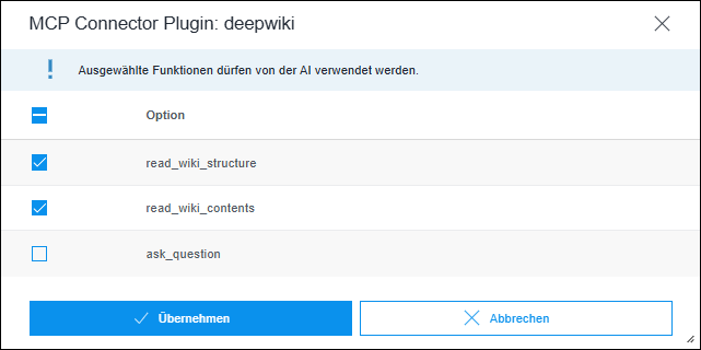 Um die Verwendug einer Funktion eines konfigurierten Servers, z.B. eines MCP-Servers, für eine Operation zu erlauben, müssen Sie diese für die Operation aktivieren: